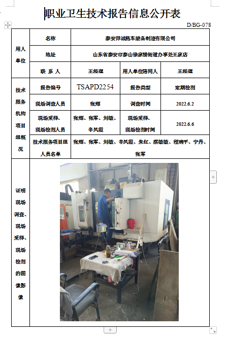 泰安悍诚拖车装备制造有限公司职业卫生定期检测