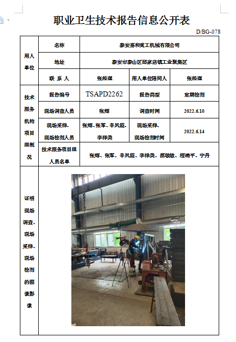 泰安嘉和重工机械有限公司职业卫生定期检测