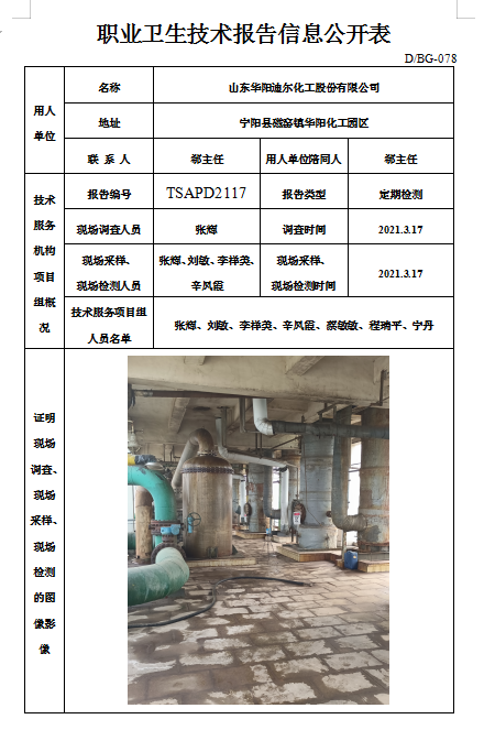 山东华阳迪尔化工股份有限公司职业卫生定期检测