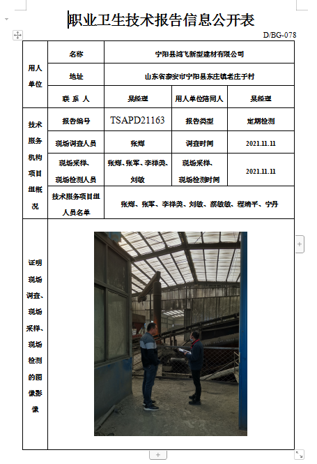 宁阳县鸿飞新型建材有限公司职业卫生定期检测