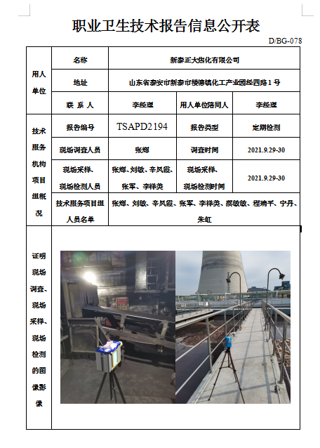 新泰正大焦化有限公司职业卫生定期检测
