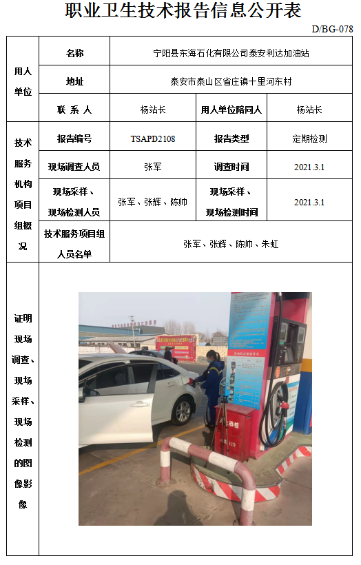 宁阳县东海石化有限公司泰安利达加油站职业卫生定期检测