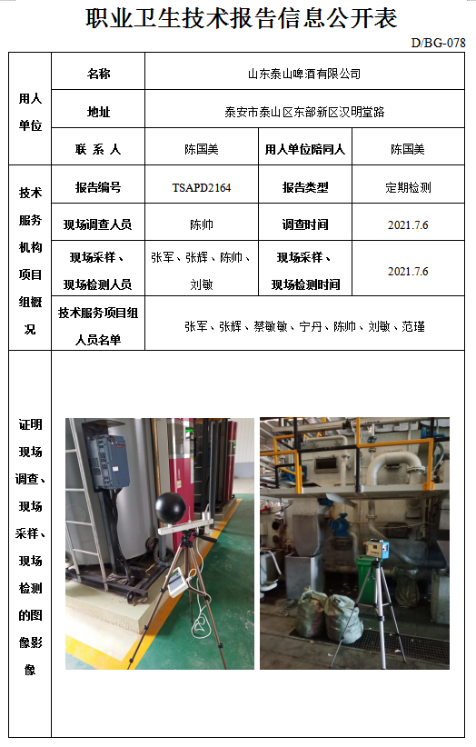 山东泰山啤酒有限公司职业卫生定期检测