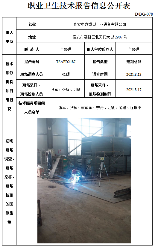 泰安中意重型工业设备有限公司职业卫生定期检测