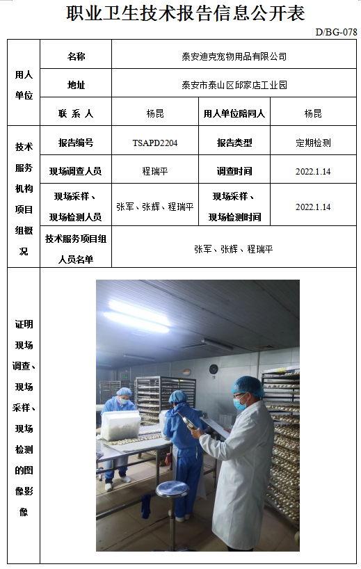 泰安迪克宠物用品有限公司职业卫生定期检测