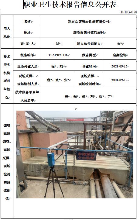 新泰众客瑞嘉食品有限公司职业卫生定期检测