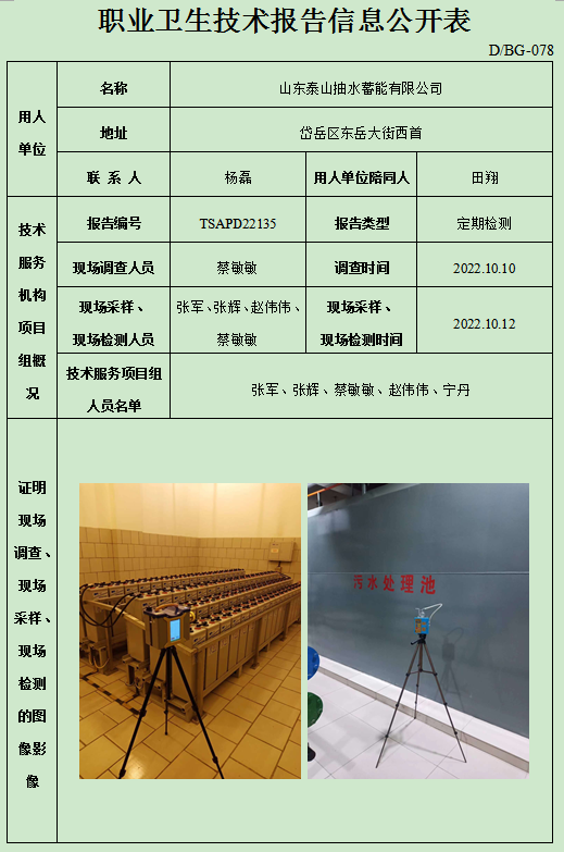山东泰山抽水蓄能有限公司职业卫生定期检测