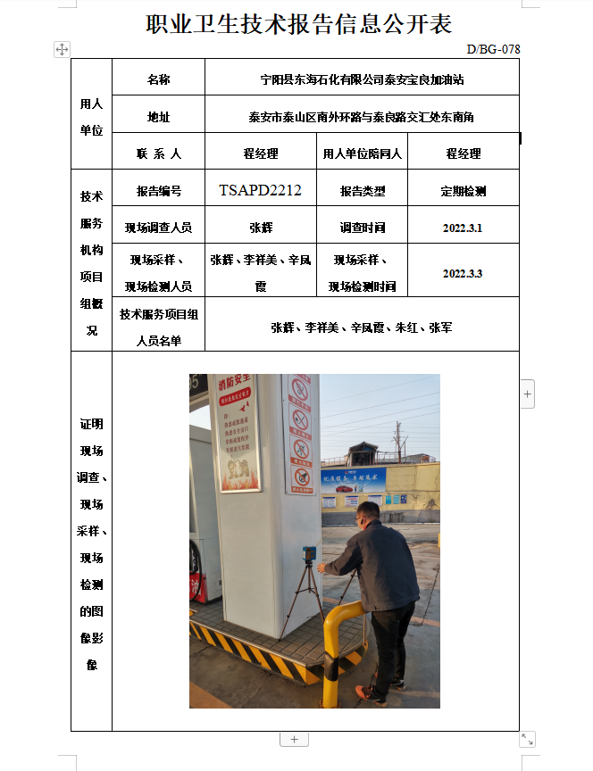 宁阳县东海石化有限公司泰安宝良加油站职业卫生定期检测