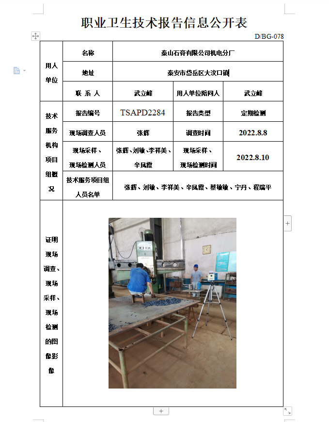 泰山石膏有限公司机电分厂职业卫生定期检测