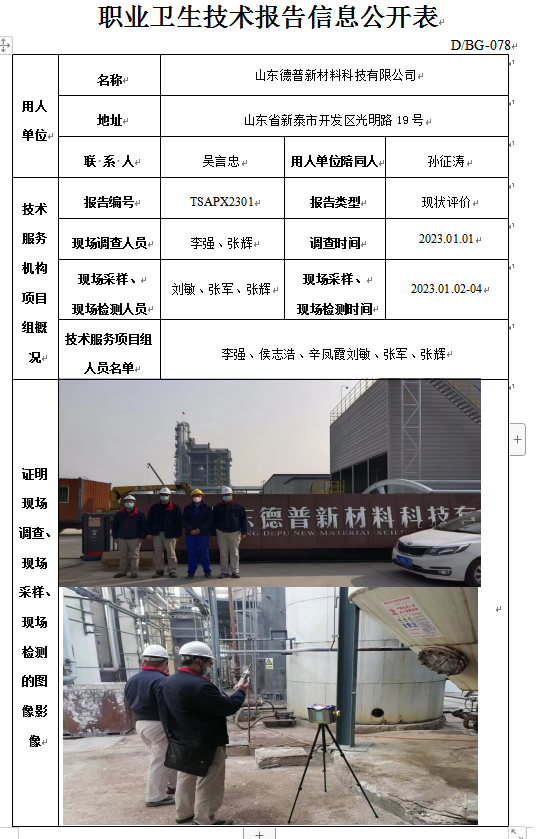 山东德普新材料科技有限公司职业病危害现状评价报告书