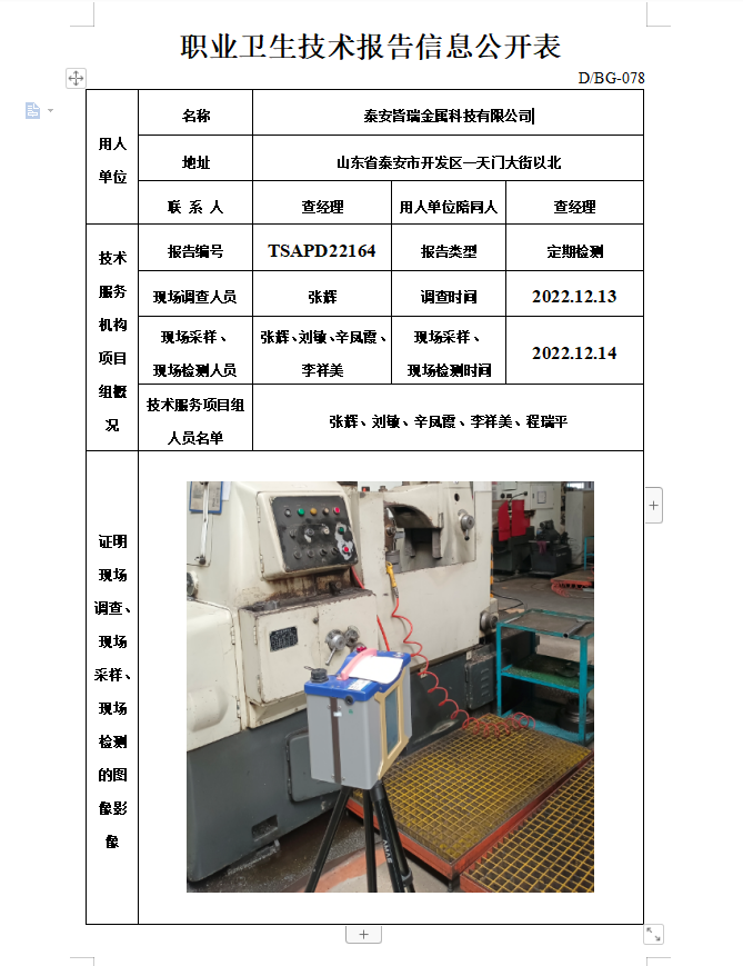 泰安皆瑞金属科技有限公司职业卫生定期检测
