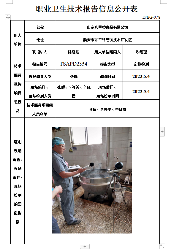 山东八里香食品有限公司职业卫生定期检测