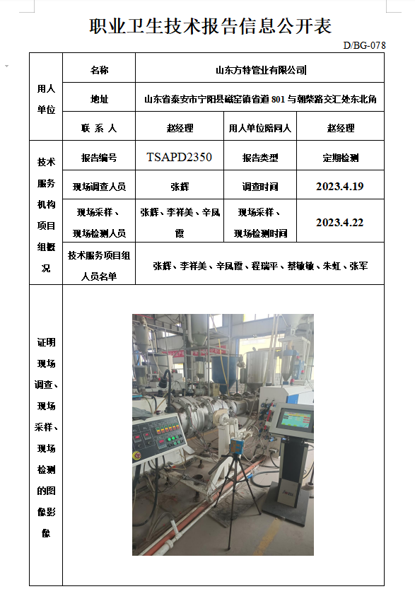 山东方特管业有限公司职业卫生定期检测