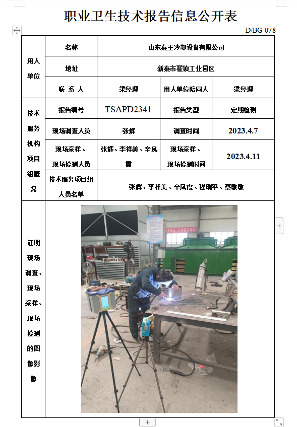 山东泰王冷却设备有限公司职业卫生定期检测