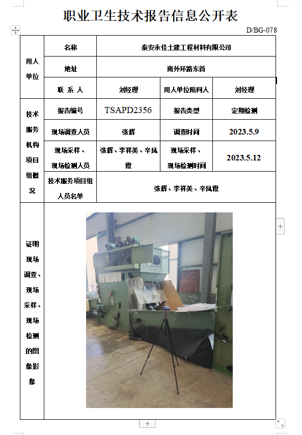 泰安永佳土建工程材料有限公司职业卫生定期检测