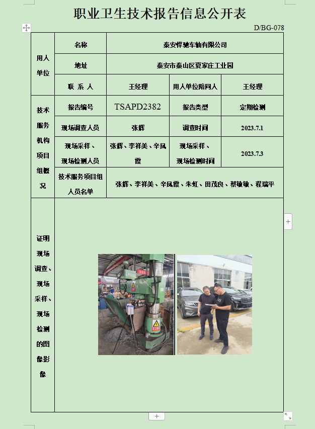 泰安悍驰车轴有限公司职业卫生定期检测