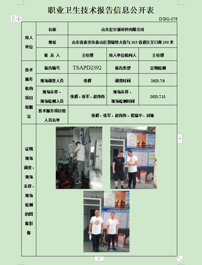 山东宏宇新材料有限公司职业卫生定期检测