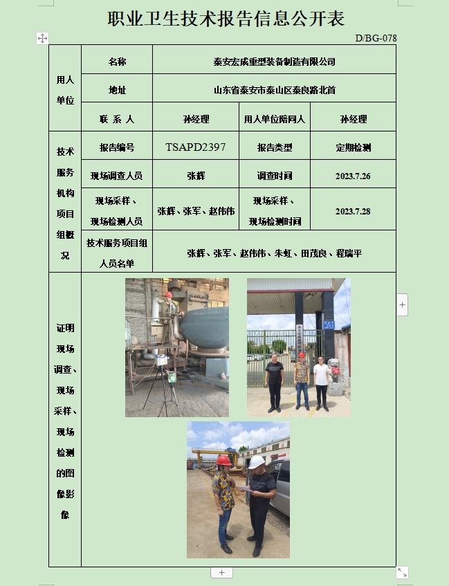 泰安宏成重型装备制造有限公司职业卫生定期检测