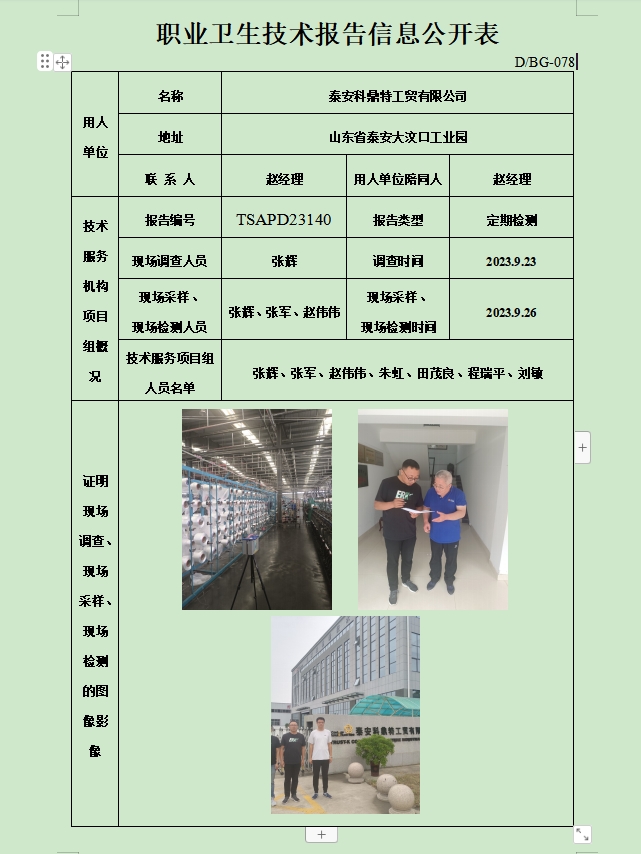 泰安科鼎特工贸有限公司职业卫生定期检测