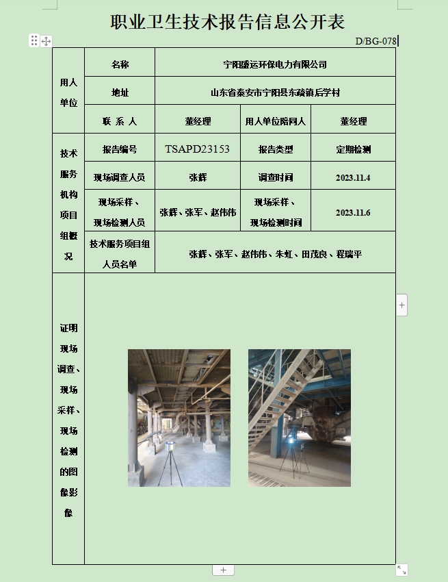 宁阳盛运环保电力有限公司职业卫生定期检测