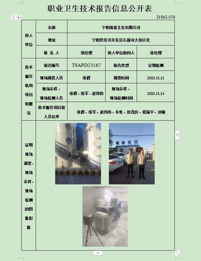 宁阳靖泰生化有限公司职业卫生定期检测