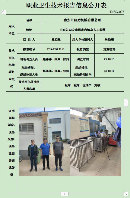 泰安市凯力机械有限公司职业卫生定期检测