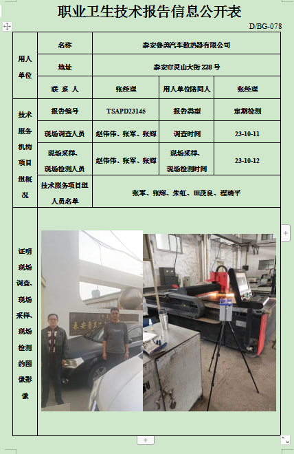 泰安鲁美汽车散热器有限公司职业卫生定期检测