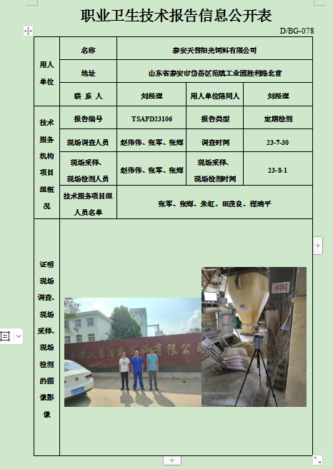 泰安天普阳光饲料有限公司职业卫生定期检测