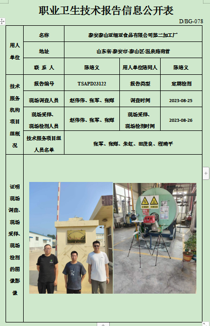 泰安泰山亚细亚食品有限公司第二加工厂职业卫生定期检测