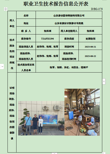 山东泰安雲琦钢结构有限公司职业卫生定期检测