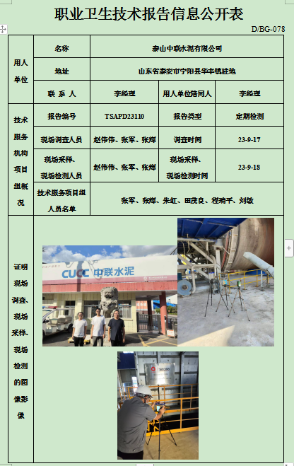 泰山中联水泥有限公司职业卫生定期检测