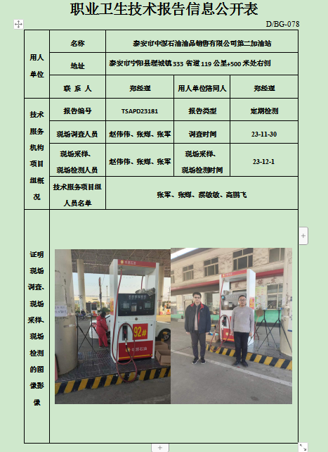 泰安市中源石油油品销售有限公司第二加油站职业卫生定期检测