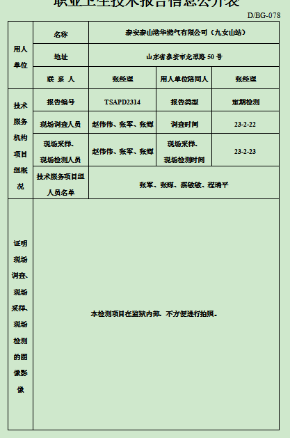 泰安泰山港华燃气有限公司(九女山站)职业卫生定期检测