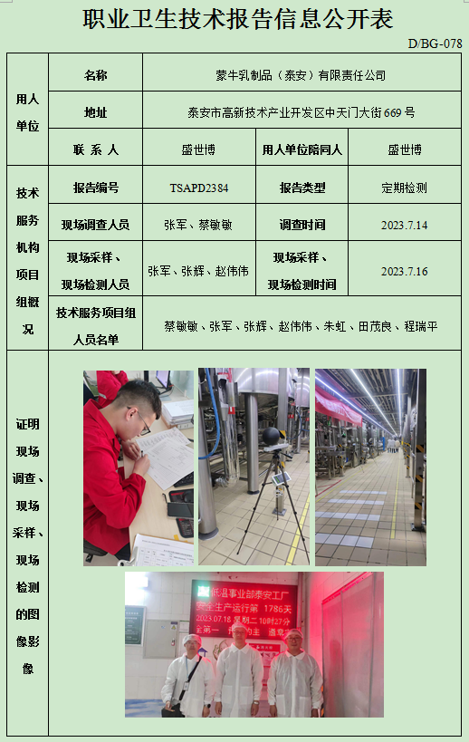 蒙牛乳制品(泰安)有限责任公司职业卫生定期检测