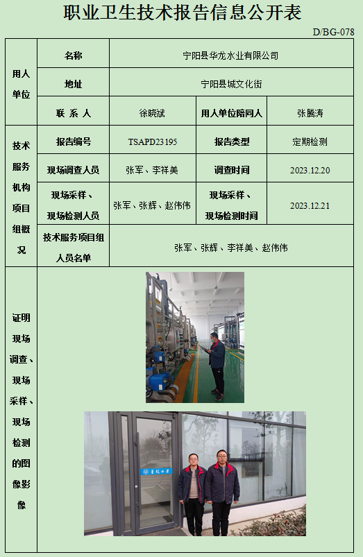 宁阳县华龙水业有限公司职业卫生定期检测