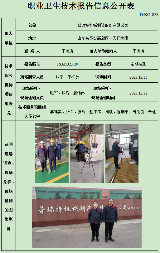 普瑞特机械制造股份有限公司职业卫生定期检测