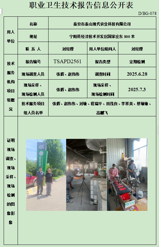 泰安市泰山现代农业科技有限公司职业卫生定期检测