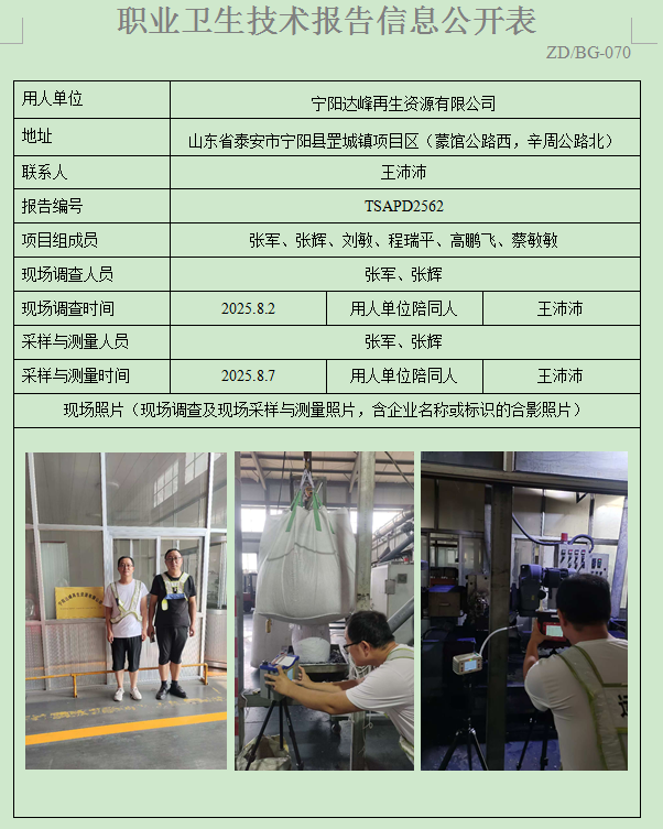 宁阳达峰再生资源有限公司职业卫生定期检测