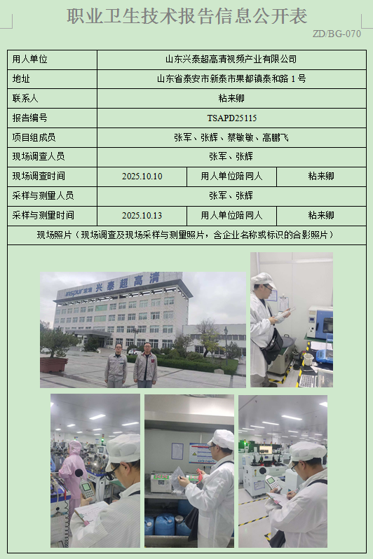 山东兴泰超高清视频产业有限公司职业卫生定期检测
