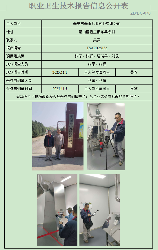 泰安市泰山九牧药业有限公司职业卫生定期检测