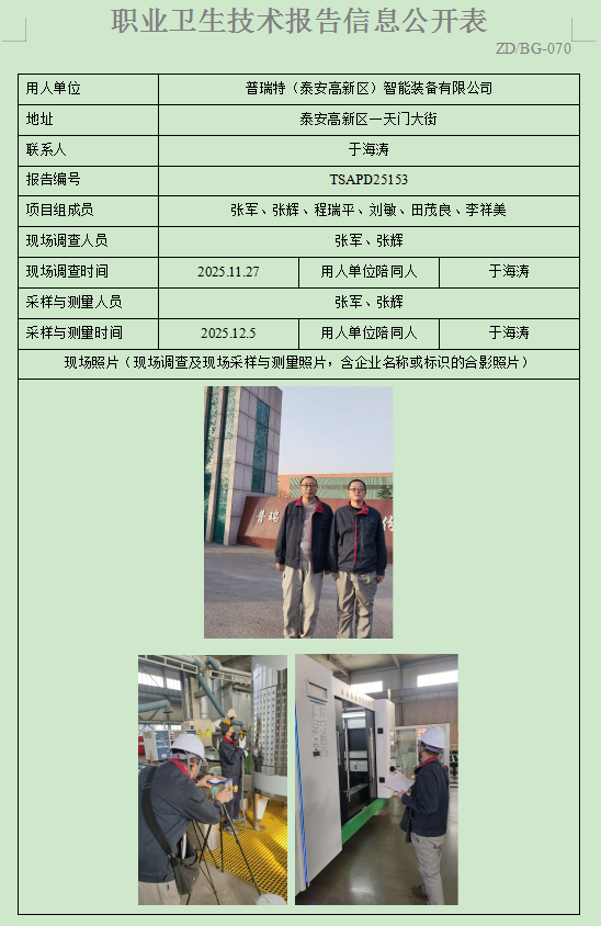 普瑞特(泰安高新区)智能装备有限公司职业卫生定期检测